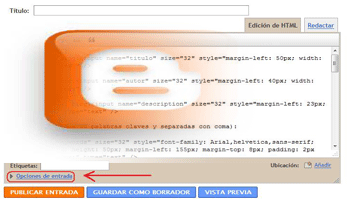 3) Haz clic sobre el enlace que dice 'Opciones de entrada' en la esquina de abajo a la izquierda del editor y en el apartado Fecha y hora de la entrada incluye una fecha que contenga años futuros como 2020 etc...