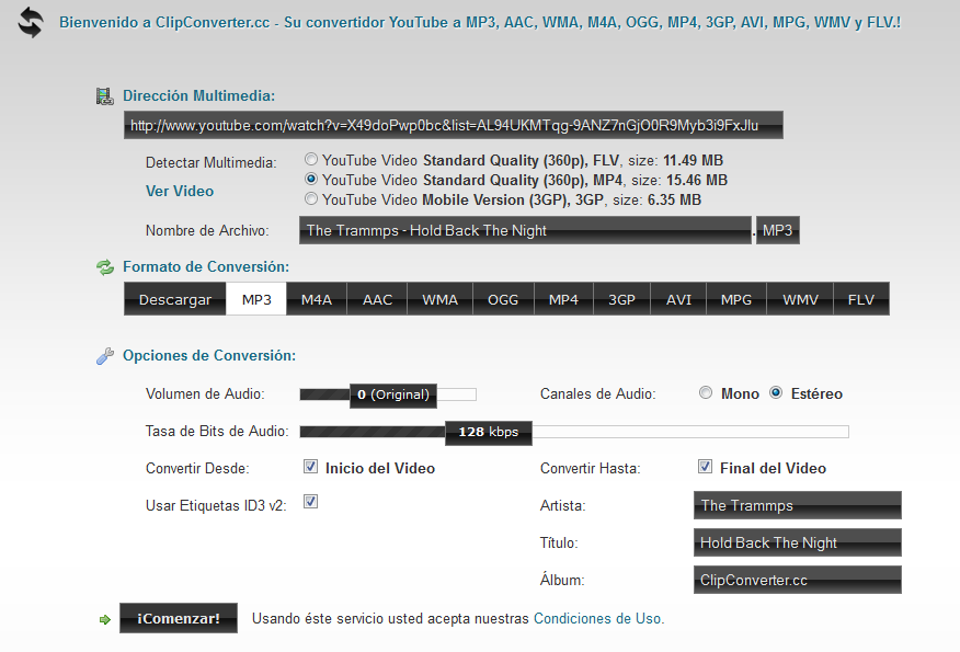 A muchos nos a pasado,que viendo un video en youtube quisieramos tener la cancion de dicho video en nuestra pc,pero no encontramos la forma de comvertirlo a MP3 y descarcarlo,existen varios programas para convertir estos videos pero no todos cumplen con nuestros requisitos,si lo que buscamos es algo que sea gratis que no tengamos que registrarnos que no tengamos que descargarlo a nuestra pc etc... Es ClipConverter .Todo es online,en linea Este es un convertidor de videos a otros formatos,como MP3 .wma, .aac, .m4a, .ogg, .3gp, .avi, .wmv y .flv . Con Clipconverter, podemos hacerlo de manera sencilla y todo funciona bien.